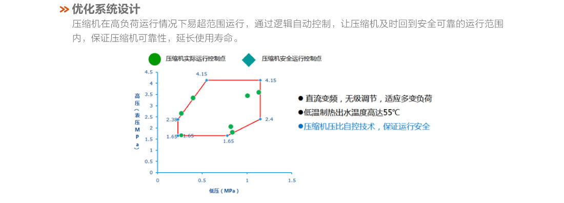 采用直流變頻技術,制熱量范圍8.5~16kW,穩(wěn)定運行環(huán)境溫度范圍-20℃~28℃、出水溫度范圍25~55℃,具有低溫強熱、節(jié)能高效、穩(wěn)定可靠等特點,適用于集中供暖覆蓋不足的農(nóng)村及城郊地區(qū)以及城市獨立供暖的公寓、復式樓、別墅、單元寫字樓、餐廳、商店、娛樂場所等空間.